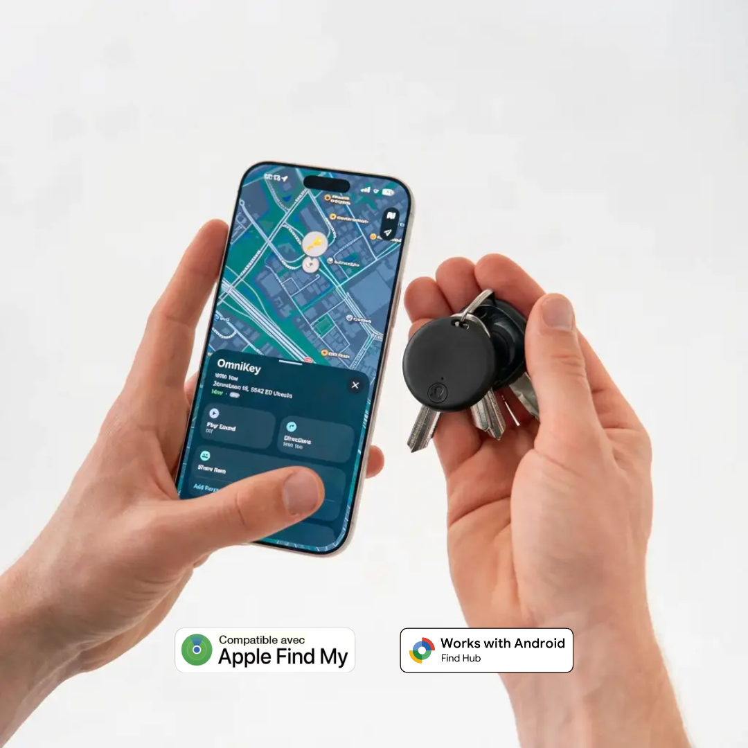 Conçu en France, omnikey est compatible avec Apple Find My ou Google Find Hub selon votre modèle. Rechargeable, fiable et prêt à vous suivre partout.